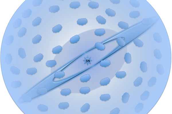 «Probabilmente, questo materiale circumstellare non era distribuito uniformemente attorno alla stella, ma era soprattutto distribuito su un disco la cui estensione era maggiore di 0.5 anni luce» spiega Benetti. «Dunque la stella ha perso questo disco di materia in modo costante per molto tempo prima di esplodere». «Fatto insolito per questi tipi di studi, abbiamo rintracciato in dati di archivio la luce emessa dalla stella progenitrice nella riga H-alfa dell’idrogeno ionizzato, otto anni prima di esplodere» aggiunge Benetti. «Questa osservazione fondamentale ci ha detto che l’oggetto celeste inizialmente era una stella abbastanza massiccia, con una massa 25 volte quella del Sole».