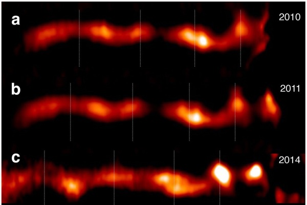 La cosa più sensazionale è che, dal confronto temporale tra le nostre immagini e quelle di Hubble, si è potuto notare che tali strutture si muovono. Le loro velocità sono molto elevate tanto che le strutture più esterne sembrano muoversi di moto non-Kepleriano, associato al disco. Estrapolando le osservazioni indietro nel tempo sembra di poter trovare un’origine di tali strutture circa 15 anni fa».